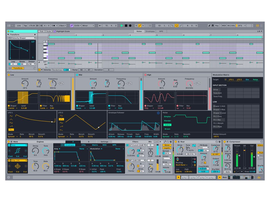- Nieuwe apparaten: creëer alles, van subtiele en precieze mastering-warmte tot wilde en onvoorspelbare geluidsdegradatie met Roar, Live’s nieuwe verzadigings- en kleur-effect. Verken nieuwe texturen en klankkleuren met de schaalgevoelige geluidsengines van Meld. Of ga nog expressiever aan de slag met Robert Henke’s nu MPE-compatibele granulaire synthesizer, Granulator III.