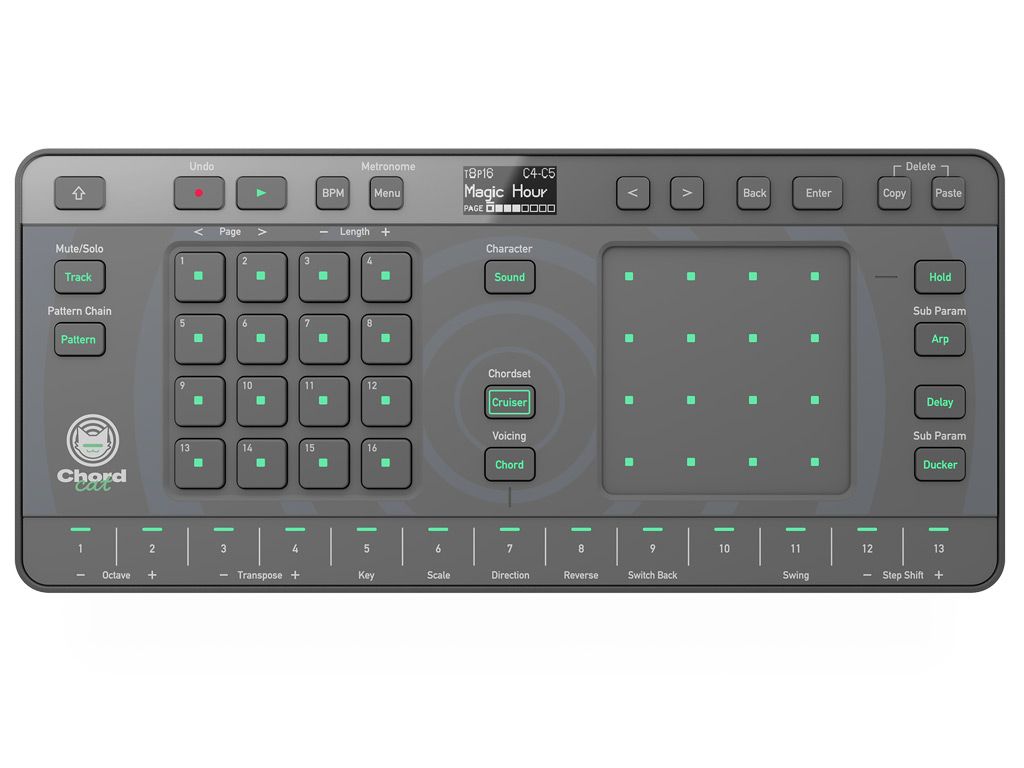 ChordCat is uitgerust met 145 preset-sounds en 16 drumkits die gesequenced kunnen worden via de 128-stappen sequencer. Deze beschikt over 8 tracks met 16 patronen per track. De sequencer wordt bediend met het raster van 16 knoppen aan de linkerkant, terwijl het XY-pad aan de rechterkant gebruikt wordt om parameters in verschillende modi te bewerken. De rij van 13 knoppen aan de onderkant kan fungeren als een conventioneel keyboard of gebruikt worden om akkoorden in een sequence te triggeren.
