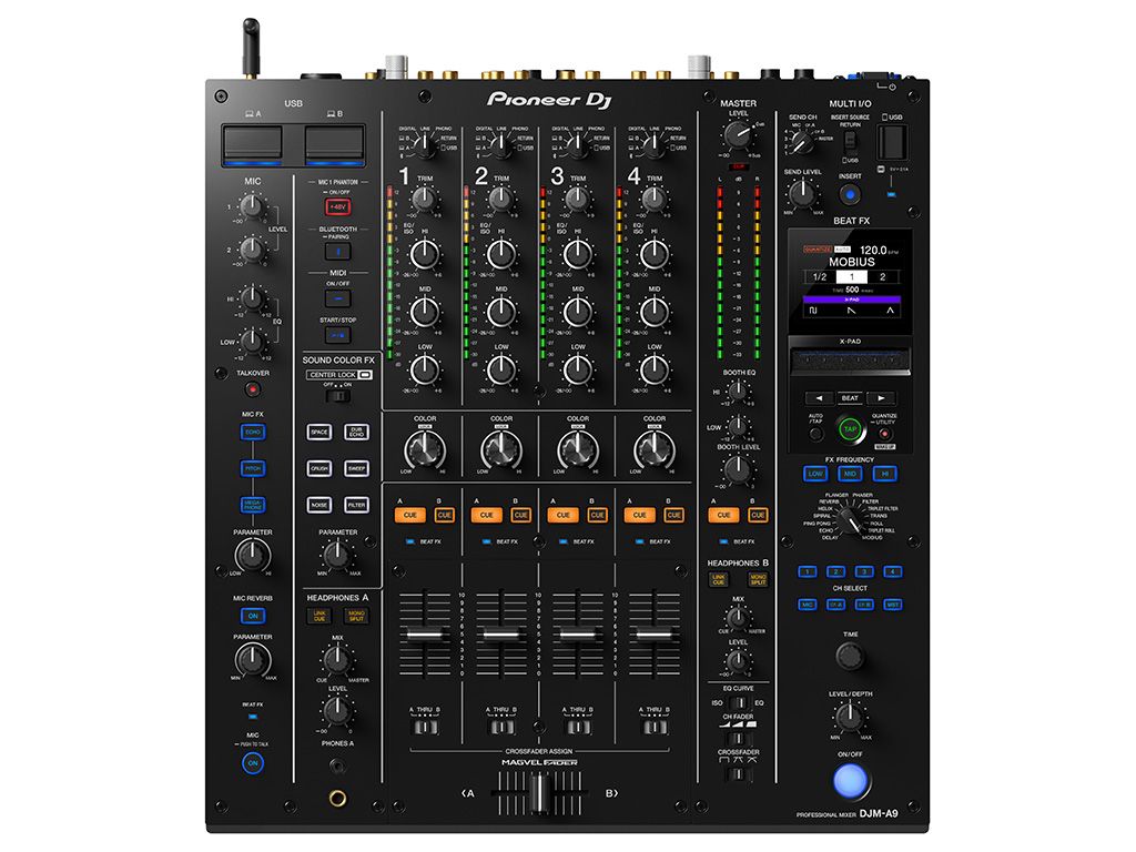 De Pioneer DJ DJM-A9 is een vier-kanaals DJ mixer voor professioneel gebruik. Nieuwe features omvatten onder andere verbeterde geluidskwaliteit dankzij 32-bit A/D en D/A converters, een innoverend Center Lock mechanisme voor Sound Color FX en een verbeterde microfoonsectie met eigen effecten. Ook Bluetooth, een dubbel cue-systeem en uitgebreidere connectiviteit vind je op deze nieuwe clubstandaard.