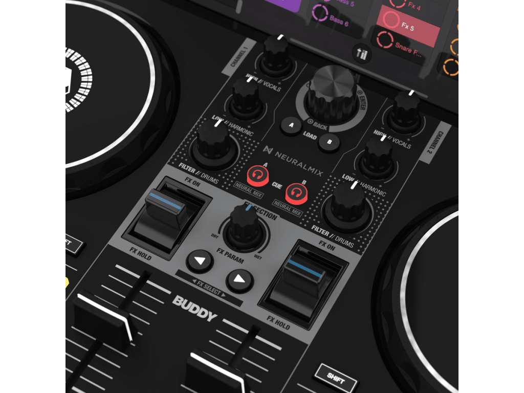 De Reloop Buddy bevat ook uitgebreide Neural Mix™-bedieningselementen voor zowel de pad als de EQ-modus. Door een eenvoudige schakelaar op de controller te gebruiken, kunnen gebruikers de EQ-knoppen onmiddellijk veranderen in speciale Neural Mix™-bedieningselementen, waardoor drums, instrumenten en zang in realtime kunnen worden geïsoleerd, waardoor de AI-aangedreven technologie van Algoriddim volledig wordt benut.